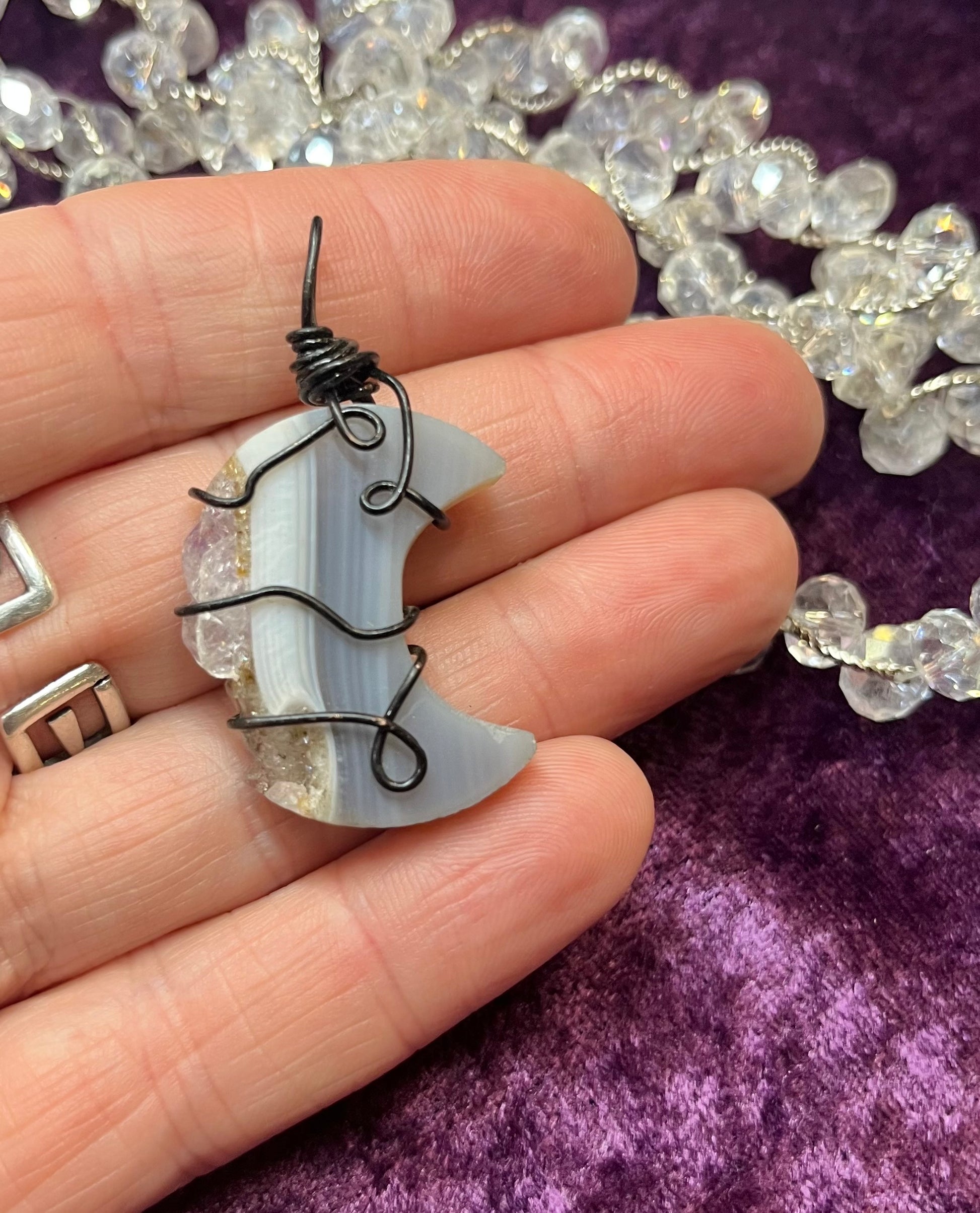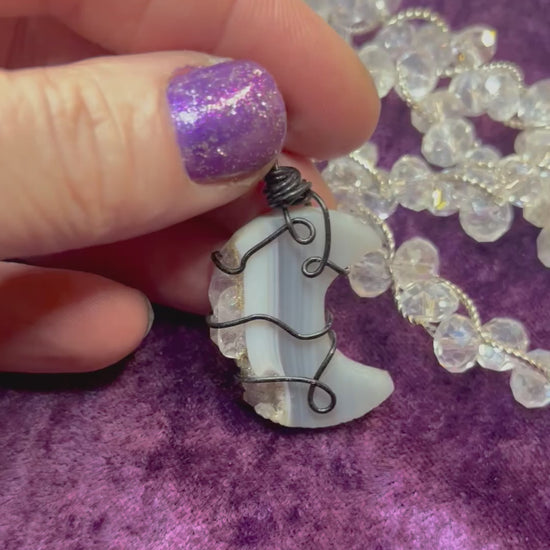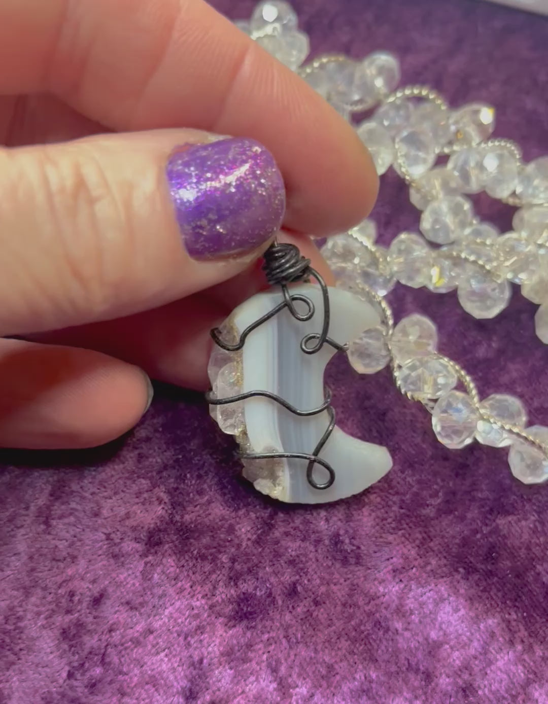 Amethyst & Agate Crescent Moon Pendant — Black Wire-Wrapped Crystal Necklace