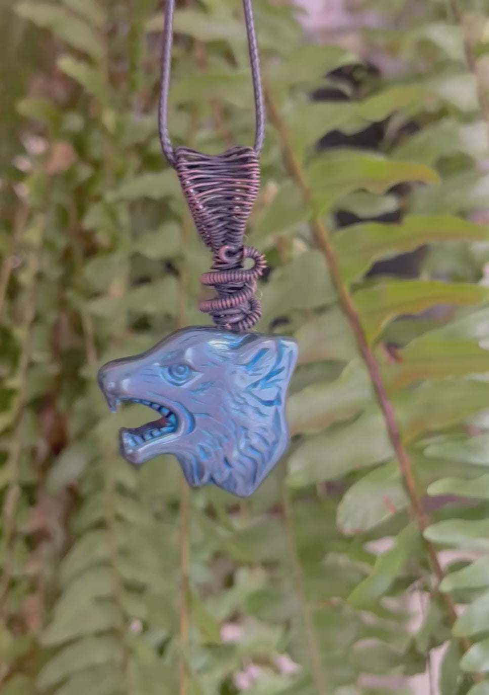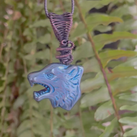 This handmade necklace features a striking carved Rainbow Obsidian wolf, wrapped by hand in darkened copper wire to create a powerful talisman of protection, instinct, and inner strength.