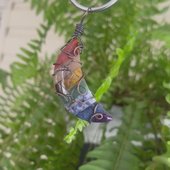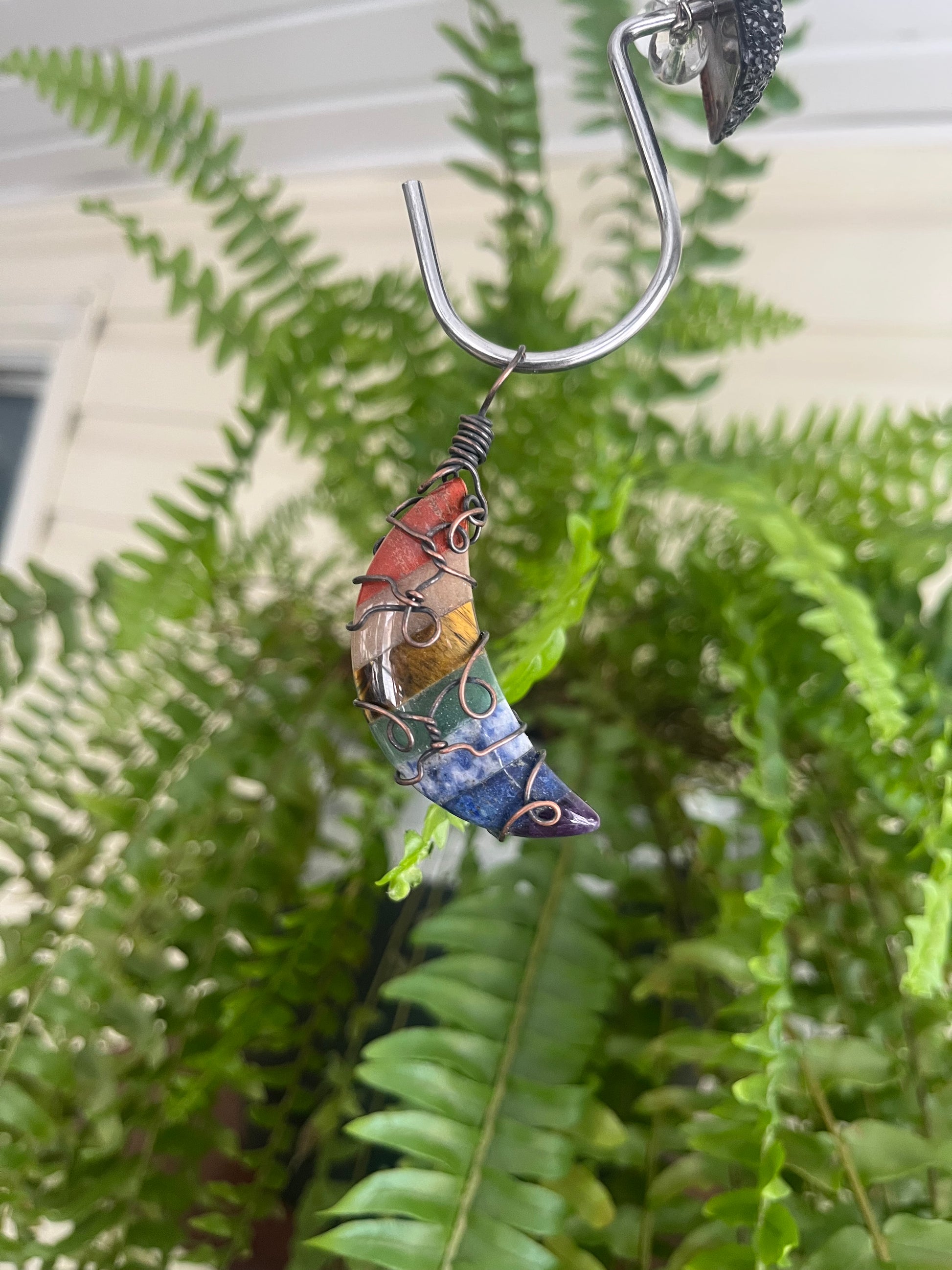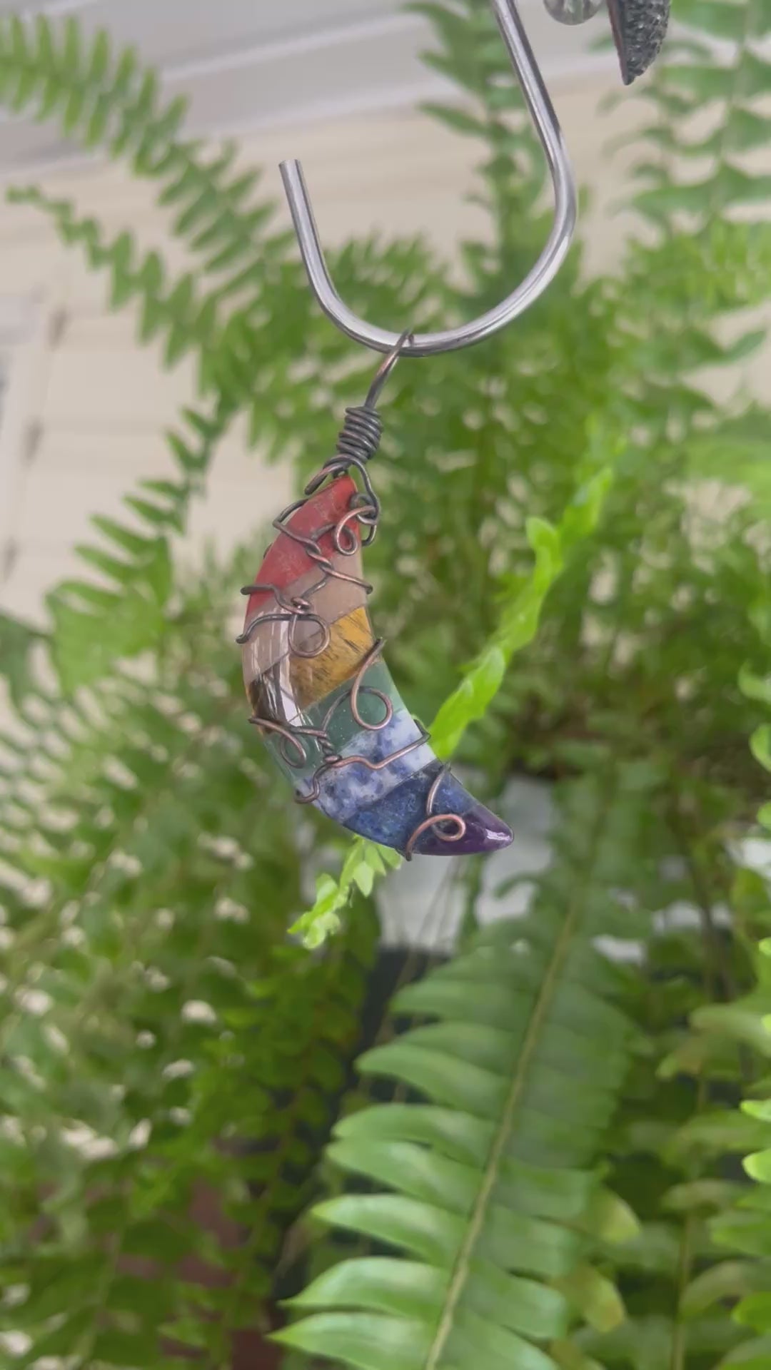 This one-of-a-kind Chakra Moon Pendant is hand wire-wrapped in warm copper and features stones, each representing the energy of the seven chakras. Shaped like a crescent moon, this piece symbolizes intuition, balance, and spiritual alignment.