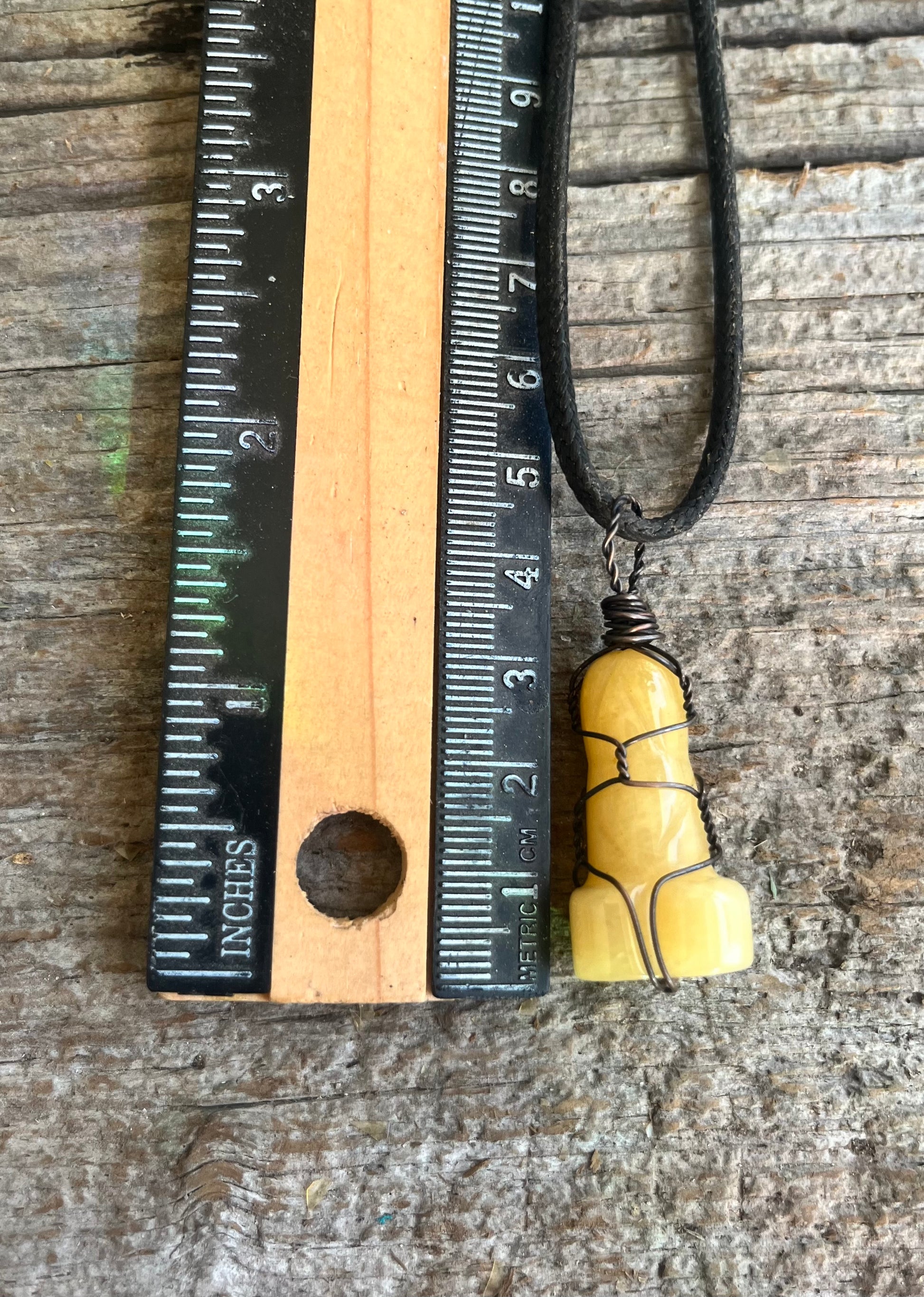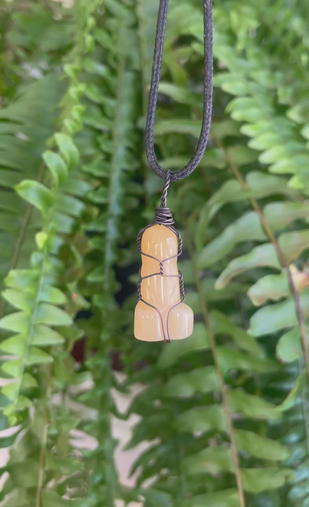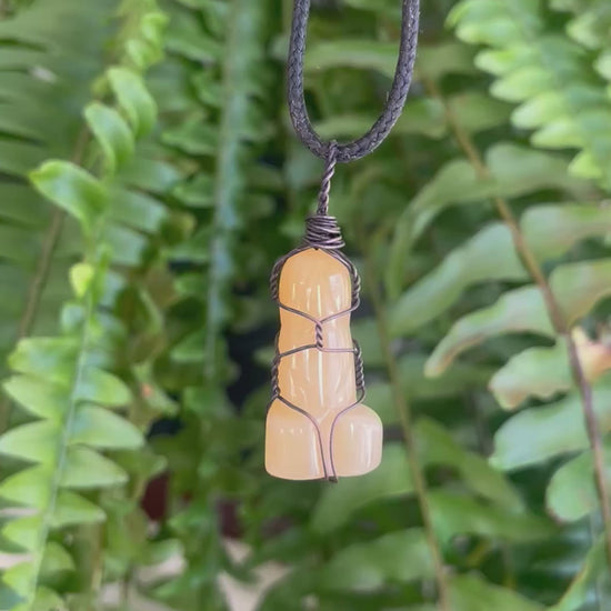 This one-of-a-kind yellow agate pendant is carved and copper wire wrapped to showcase both the natural beauty of the stone—and its unmistakably cheeky silhouette. Sometimes the stone chooses the shape, and honestly…just respect its confidence.