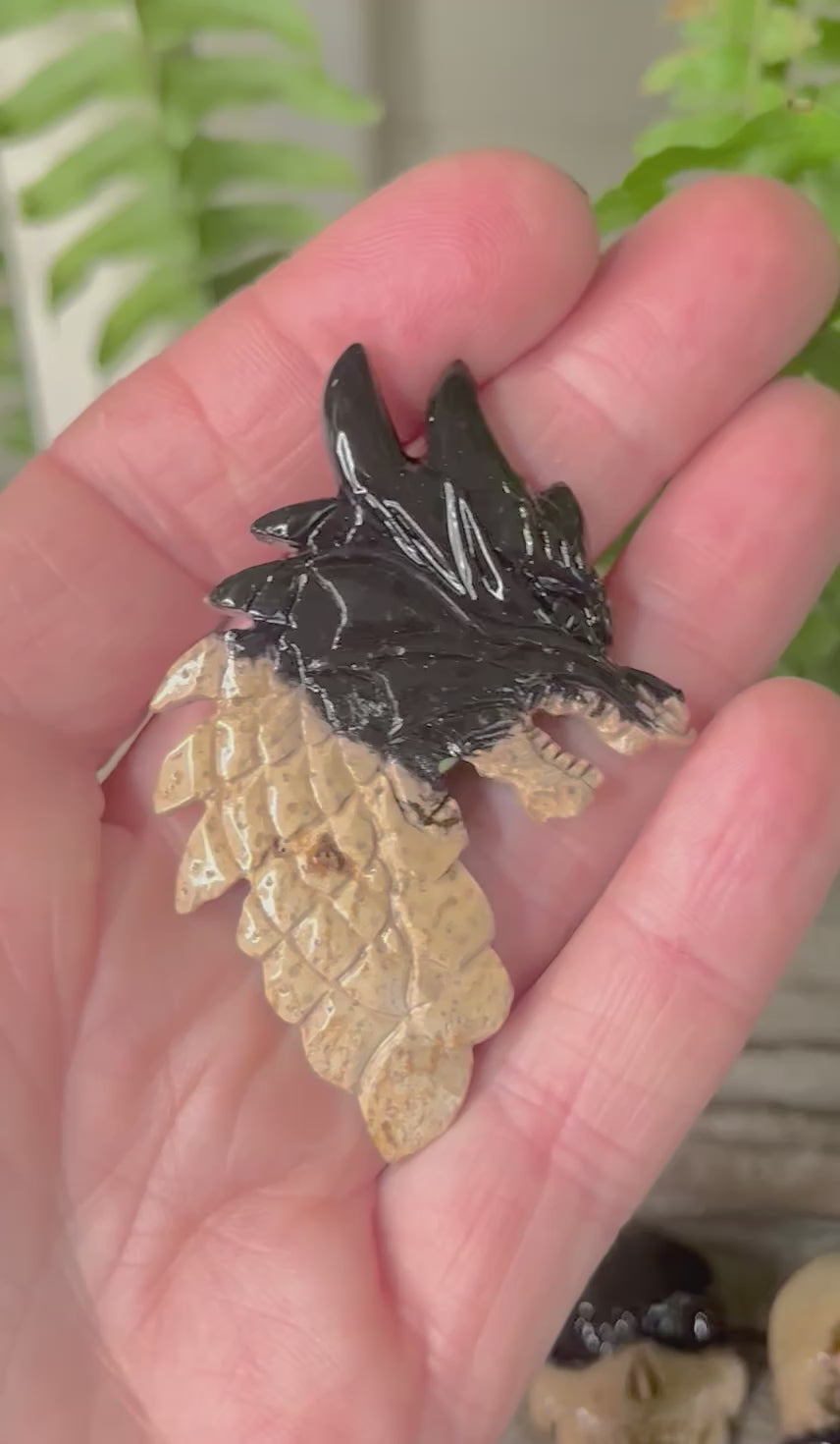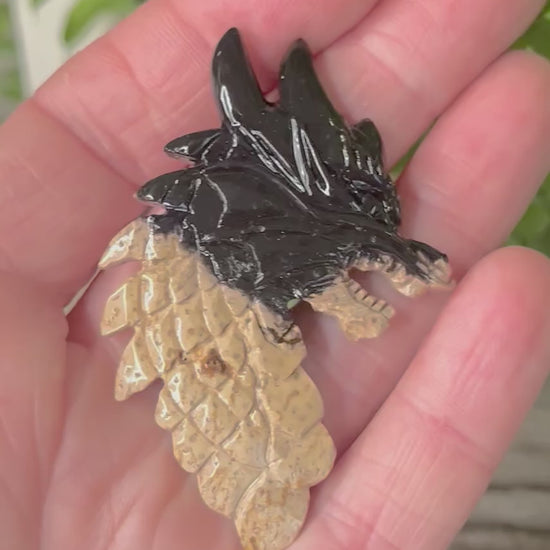This striking black and white palm root stone dragon head carving features a powerful blend of natural textures and bold contrast. The upper portion of the piece is a sleek, glossy black, carved into the fierce head and spiked mane of a dragon — symbolizing strength, protection, and transformation. The lower half transitions into creamy beige fossilized palm root, showcasing intricate scale details and the unique fossil patterns of the stone.