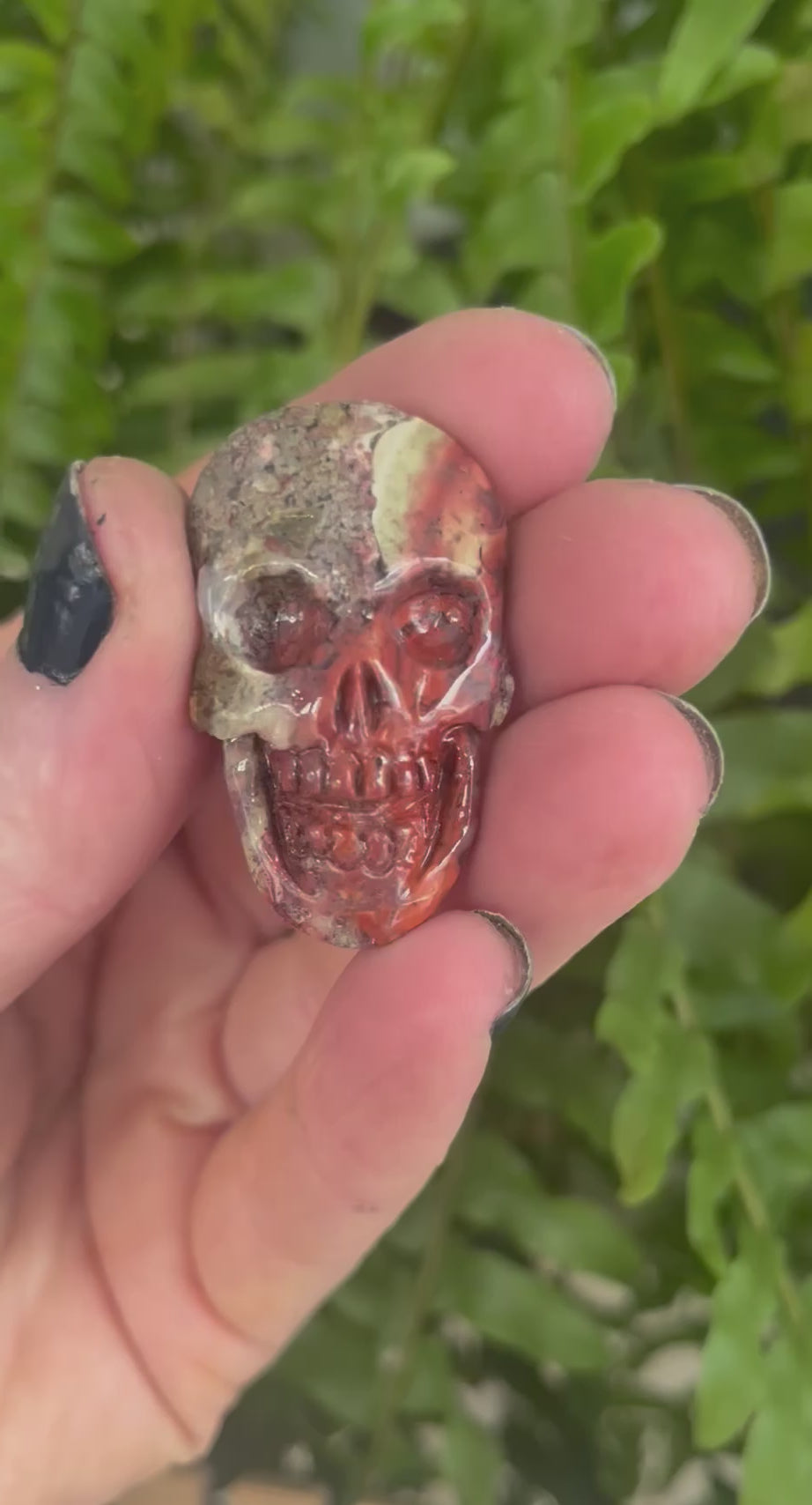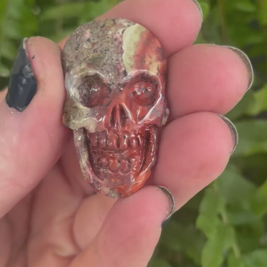 This palm root stone skull has a beautiful mix of earthy and fiery tones. Its colours include deep reddish-browns, rusty oranges, beige, olive green, and hints of gray and cream. The stone’s natural patterning gives it a striking, almost fossilized appearance, with polished areas that bring out its glossy texture and organic depth.
