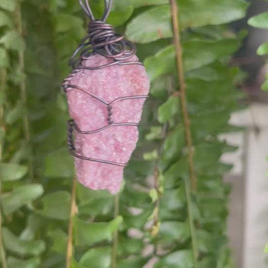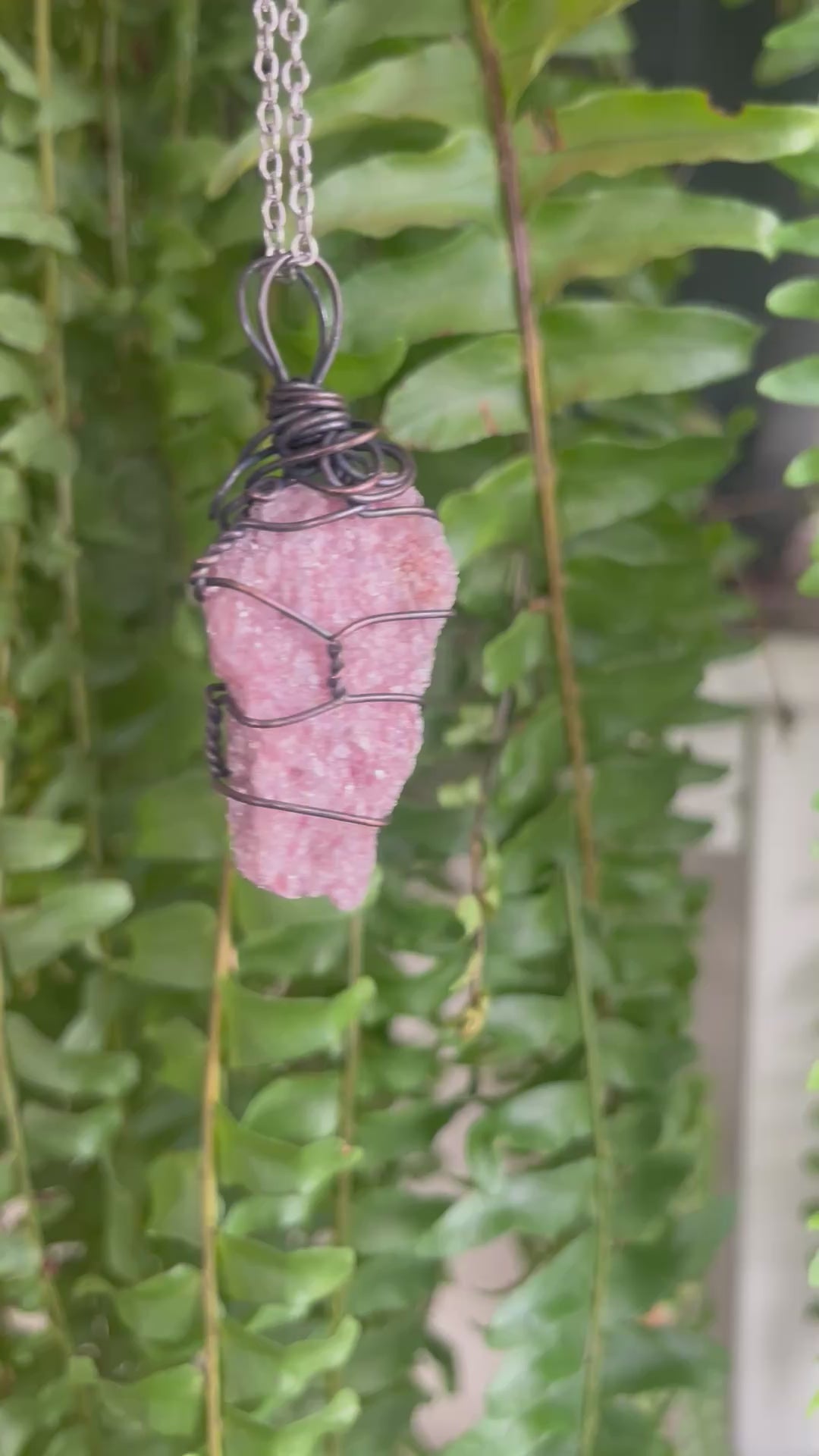 This one-of-a-kind piece features glitter granite, a richly textured stone with a pink-red hue and natural shimmer that catches the light just right. I personally rock-hounded and collected this stone from the earth, giving it a special place in my collection as a piece I’ve worked with from its raw origin. After some hands-on lapidary work to bring out its character, I wrapped it with care to honour its natural beauty and the energy it carries.