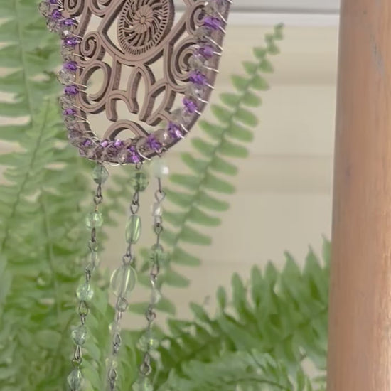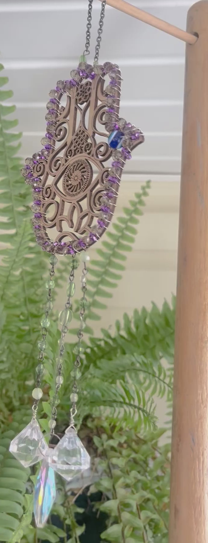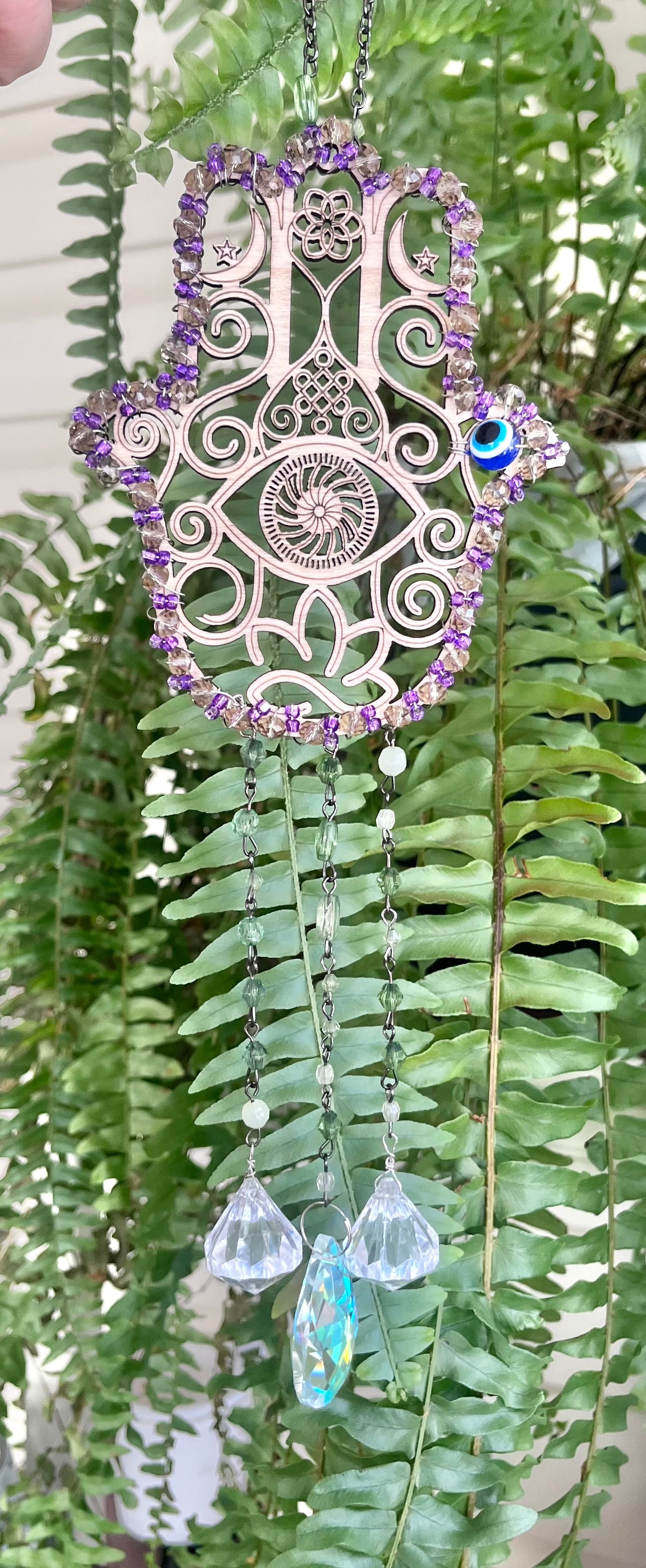 This intricate silver-tone Hamsa features delicate celestial detailing, framed with purple & dark silver-toned beads and accented with a protective evil eye charm. Below, cascading strands of faceted glass and iridescent crystal prisms catch the sunlight, scattering rainbow reflections across your walls and windows.