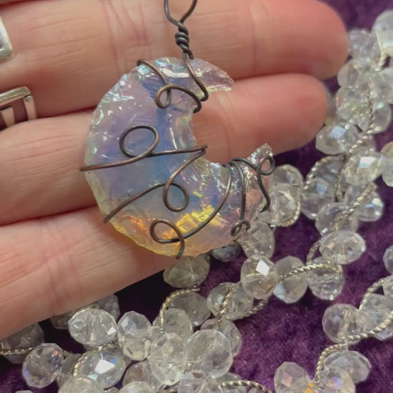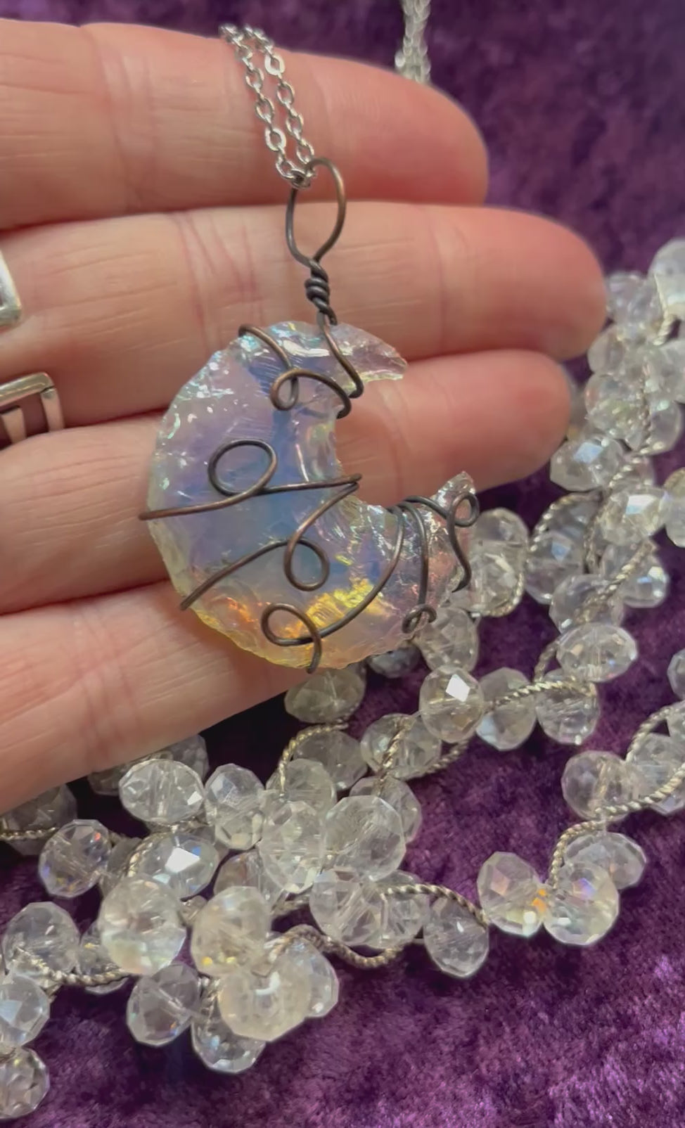Iridescent Crescent Opalite Pendant — Hand-Wrapped in “Antiqued” Copper Wire